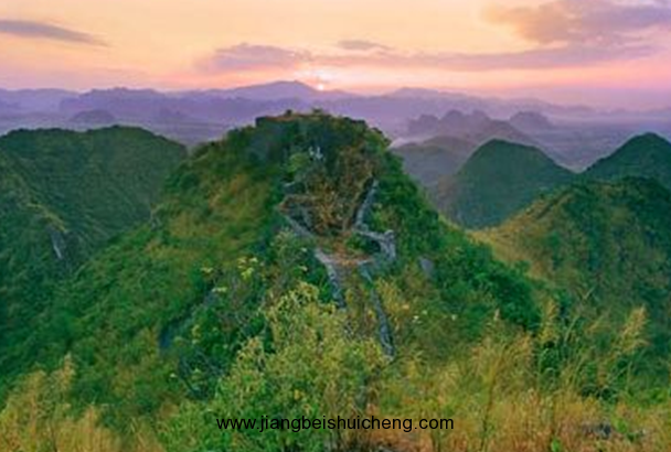 去龍州城十里,過龍北農(nóng)場,那高聳入云的將山,就象一道綠色的屏障橫亙在面前。沿著座座峰巒,一道深灰色的古建筑物就象“灰色長龍”,蜿蜒伸展,這便是屹立南疆邊睡的古炮臺群。因它綿延數(shù)十里,相連一體,故名曰“小連(壘)城”。