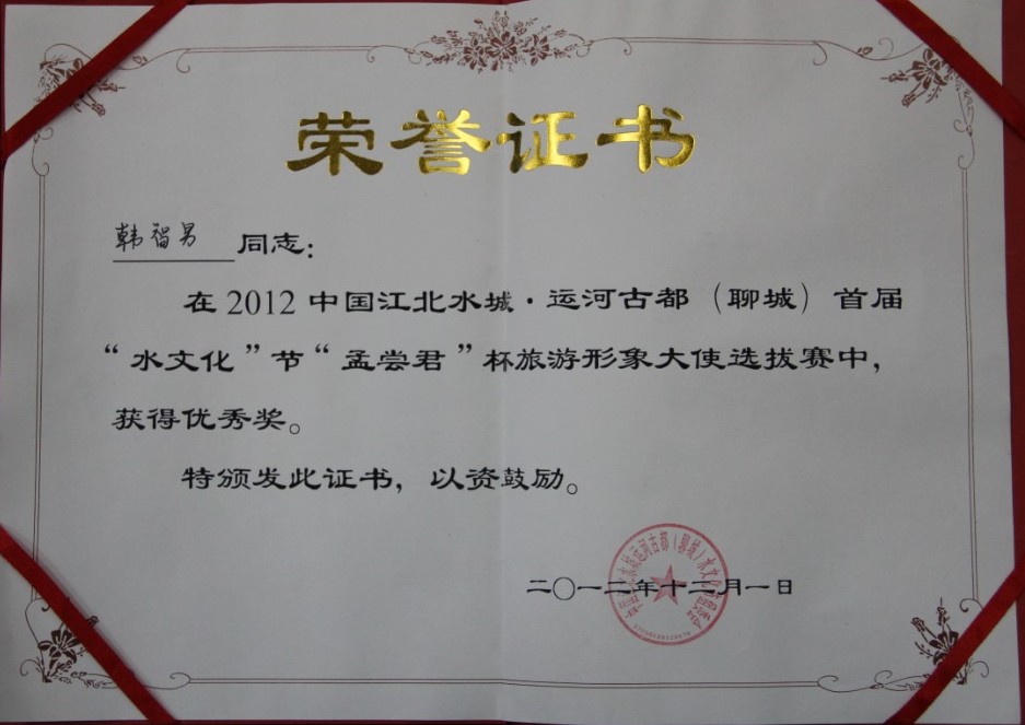 熱烈祝賀聊之旅國際旅行社導游部成員韓智男獲得聊城水文化節優秀獎