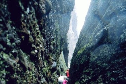 一閘險一閘,閘閘景不同。水井入谷口處,為“一道閘”。南北山崖壁立,谷底難容一足,眼前是一層樓高的“天梯”通道。出了“一道閘”,抬頭仰望南面半山崖有一處月牙形的龐然大洞;拾級而上,一個能容千人的石洞,常年干爽明亮、冬暖夏涼,這里被人們稱為“石窟王宮”。進入“二道閘”,它比起“一道閘”更加窄長、更加險峻。剛才是陽光明媚,轉眼間便是天昏地暗。抬頭便可望見兩崖撐天,便是著名的“一線天”景觀。天設地造,極其美妙。在閘內可以看見南面懸崖上飛濺出一道高約50米、寬5米的“水簾”,似乎向攀巖者彈奏出歡快的迎賓曲。“三道閘”上下約有三層樓高,人們無處落腳,比黃山的“鯽魚背”更險一籌。身后是萬丈深淵,腳下峭壁陰森,穿過小水潭,隱約能看到懸崖峭壁之間有一條縫隙,其名“地縫”,循著人工開鑿的石凹,手腳并用往上攀爬,進入谷內,有一種豁然開朗的感覺,攀上谷口時,不妨回頭細看兩石壁上閘痕清晰可辨,谷內就是古時的避王巖。