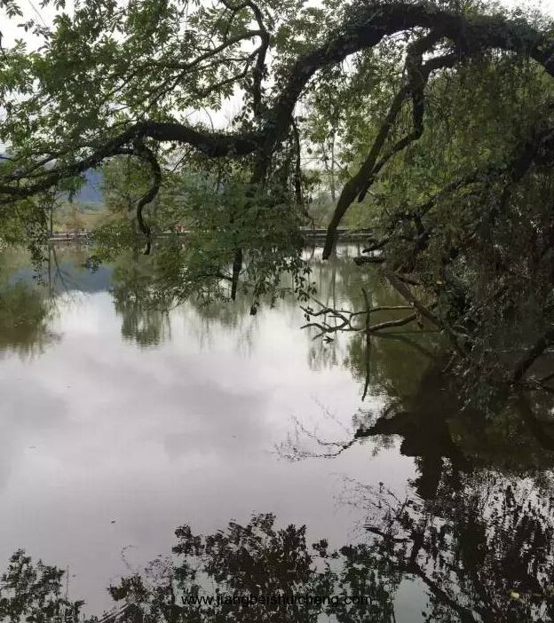 宏村的池塘,水平如鏡,波光鑠金,蕩漾著四周古民居的倒影:粉墻、黛瓦、馬頭墻、藍天白云.....,在 池塘邊,婦女在浣洗,兒童在戲耍,偶而有人從旁走過,向池塘撒下一片笑聲。