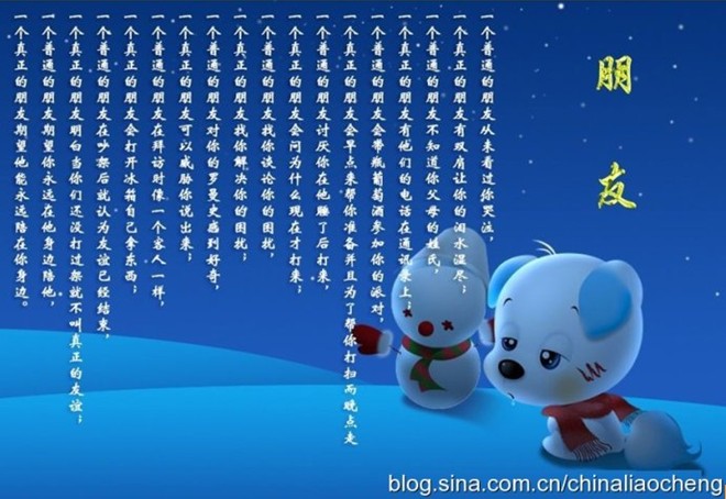 知友是你生活中的記憶、思想、激情、開心愉快的調味品。友人的印記是自己的童年,是永不再來的少年時光的象征。當歲月的年輪在遞增的時候,當你懷念起已經失去的光陰的時候,禁不住流下了又苦又甜的熱淚時。而隨著感情的強、弱、淺中所涌現出的是珍貴的友誼。這至善至美的情,是世間珍貴的愛,我們要愛惜珍之!知友是時間的見證,是幸福與患難時的對白……