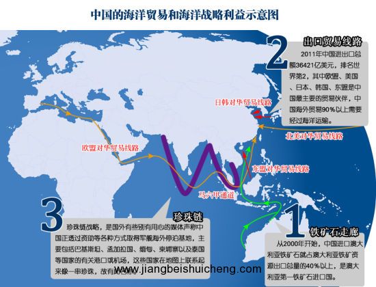 印度洋是中國(guó)重要的國(guó)際貿(mào)易通道和能源通道。首先是能源安全。自1993年中國(guó)成為石油凈進(jìn)口國(guó),截至2009年,中國(guó)已成為僅次于美國(guó)和日本的第三大石油進(jìn)口國(guó),進(jìn)口量超過(guò)2億噸,日均超過(guò)380萬(wàn)桶,已占整個(gè)石油需求量的60%,未來(lái)的需求量還會(huì)繼續(xù)攀升,而國(guó)內(nèi)產(chǎn)量到2020年將開(kāi)始下降。據(jù)羅伯特。卡普蘭估計(jì),到2020年中國(guó)的石油需求量將達(dá)到日均730萬(wàn)桶。目前中國(guó)石油進(jìn)口量的80%來(lái)自中東和非洲,經(jīng)印度洋和馬六甲海峽等通道運(yùn)至中國(guó)。雖然中國(guó)也在積極爭(zhēng)取石油進(jìn)口多元化,但原油儲(chǔ)量占世界60%、天然氣儲(chǔ)量占世界35%的印度洋地區(qū)仍是中國(guó)最可靠的石油進(jìn)口地區(qū),到2020年超過(guò)85%的石油進(jìn)口量要走印度洋航線,印度洋和馬六甲海峽地區(qū)的安全影響著這條事關(guān)中國(guó)經(jīng)濟(jì)命脈的“海上生命線”,因此被稱為中國(guó)的“馬六甲困局”。由于中國(guó)奉行和平發(fā)展戰(zhàn)略及限于自己的海軍力量,在非和平時(shí)期,中國(guó)對(duì)保障這條“海上生命線”還存在很大的困難。據(jù)統(tǒng)計(jì),中國(guó)現(xiàn)在的戰(zhàn)略石油儲(chǔ)備量不足30天,而國(guó)際能源署建議的儲(chǔ)備標(biāo)準(zhǔn)是90天,美國(guó)和日本等國(guó)的儲(chǔ)備量超過(guò)160天,其他發(fā)達(dá)大國(guó)也遠(yuǎn)超90天。一旦爆發(fā)危機(jī),中國(guó)就有可能受制于人。同時(shí),印度洋地區(qū)沿岸國(guó)家大都屬于礦產(chǎn)資源豐富的欠發(fā)達(dá)國(guó)家,由于技術(shù)和資金短缺,這些礦產(chǎn)資源基本上屬于未開(kāi)發(fā)、半開(kāi)發(fā)或開(kāi)發(fā)水平不高的狀態(tài)。隨著中國(guó)國(guó)內(nèi)資源的日益枯竭,印度洋地區(qū)的各種礦產(chǎn)資源,如銅、鋰、鈹、鎳、鈷及磷酸鹽等都是中國(guó)現(xiàn)在或未來(lái)所需的,因此中國(guó)有必要與這些國(guó)家合作以保證印度洋航線的安全。