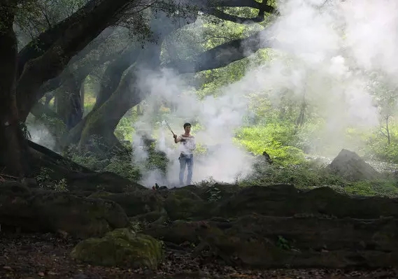 靜靜地等待一會兒,太陽出來了,拍攝時機成熟。老王開始招呼他的助理——另外兩個村民,在榕樹后面開始放煙餅。