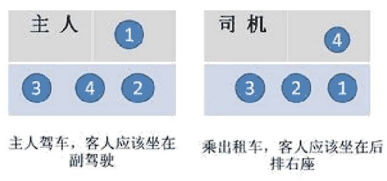 小轎車(chē)1號(hào)座位在司機(jī)的右后邊,2號(hào)座位在司機(jī)的正后邊,3號(hào)座位在司機(jī)的旁邊。(如果后排乘坐三人,則3號(hào)座位在后排的中間)。