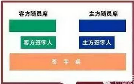 一般簽字桌橫放。簽字者面門(mén)而坐,賓右主左。參加者列隊(duì)站在簽字者之后。中央高于兩側(cè),右側(cè)高于左側(cè)。