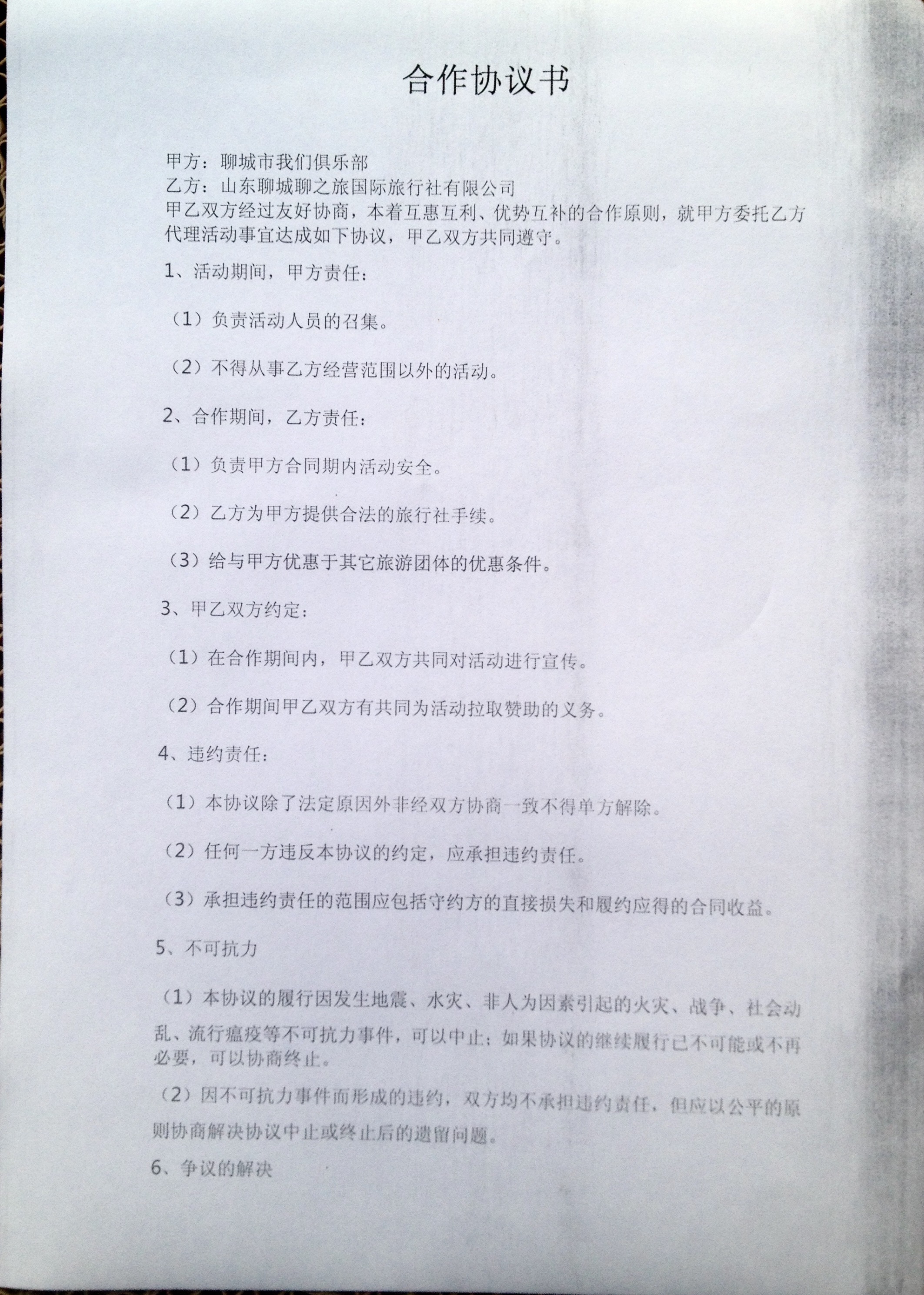 為響應國家政策號召,我們俱樂部委托山東聊城聊之旅國際旅行社有限公司代理活動事宜,雙方經過友好協商,本著互惠互利、優勢互補的合作原則,達成以下協議。