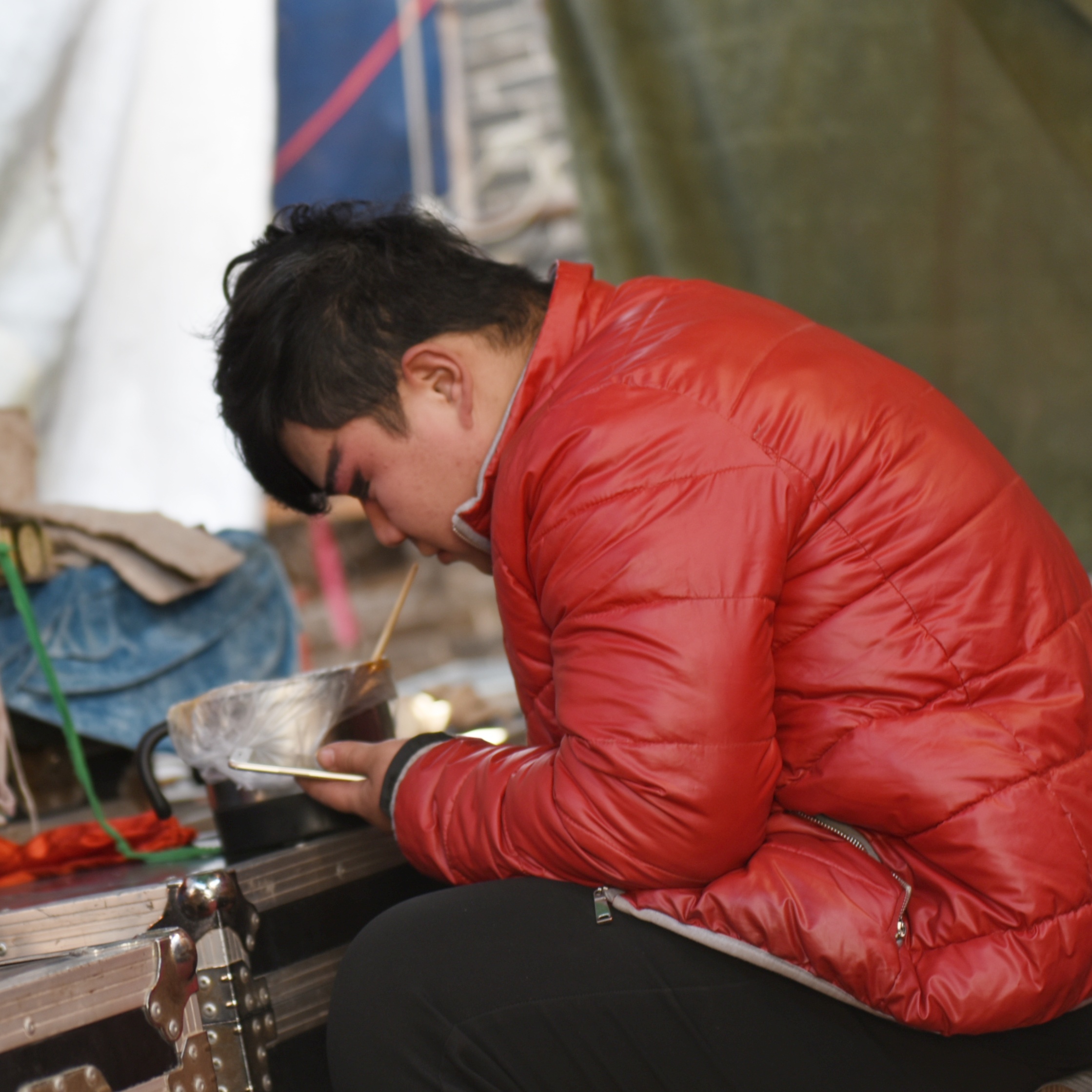 童年的記憶中我們這些頑皮的孩子,也不會依偎在父母的身旁去看、去聽自己不懂的戲曲,忙碌的后臺倒是吸引著我們的好奇心,演員的化妝、上臺前的準備、五顏綠色的戲服、一張張的大花臉,都是那么的新奇、好玩。當然此刻的我們還是那么的好奇,只是現在的手中多了一部單反。