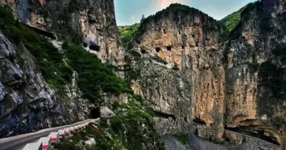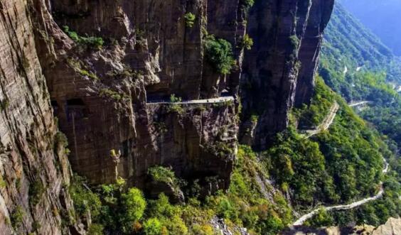 井底村著名的掛壁公路,全長1500多米長的“掛壁公路”, 39個窗口。是井底村人歷經14年的時間,在懸崖峭壁上艱難地開鑿而成的。