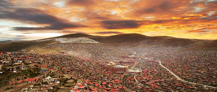 喇榮溝的一條峽谷里面,峽谷兩旁的都是密密麻麻的小紅房子,里面住著兩三萬僧眾。進溝左側住著的是女眾,稱為覺姆;進溝右側住著的是男眾,稱為喇嘛;峽谷中間屹立著兩座高大雄偉的經殿,這里是僧眾上課的地方,靠近溝口的是女眾經殿,靠里面的是男眾經殿。進入佛學院以后,可以去參觀他們上課的經殿,還可以在一旁旁聽,近距離的感受藏傳佛教的魅力。大片的紅房子也一道靚麗的風景線,可以爬到上頂,拍這壯麗的全景。在佛學院背面的上坡上,每天都要舉行一場盛大儀式---