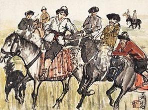 叼羊就要開始,騎士們?nèi)齼蓛傻慕o坐騎熱身。