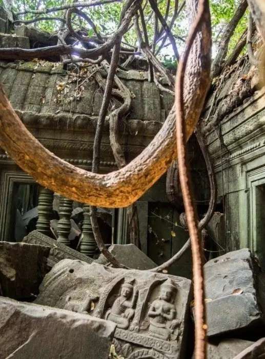 崩密列是吳哥窟公認最神秘的寺廟,崩密列的歷史還處于不明狀態,據學者推測大約建造于 11 世紀末至 12 世紀初,宮崎駿電影《天空之城》的原型,古寺搭配樹木、青苔、落葉建構出唯美的意象。整個寺廟嚴重崩塌,石頭落了一地沒有任何保護,感覺人人都可以撿走,被叢林層層覆蓋千年,各種被封死的的門,似乎里面隱藏著大秘密。