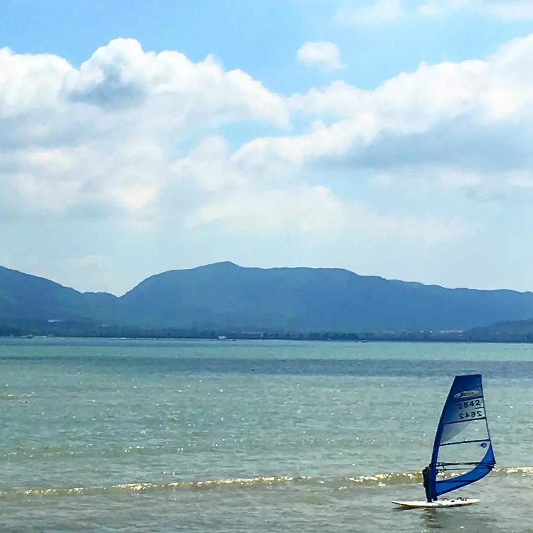 較場尾是內海,浪比較小,每年的9月份開始起風,很適合玩風箏沖浪之類的項目。還有現在很流行的空中飛人,在較場尾也有得玩,還配有專業教練一對一教學。