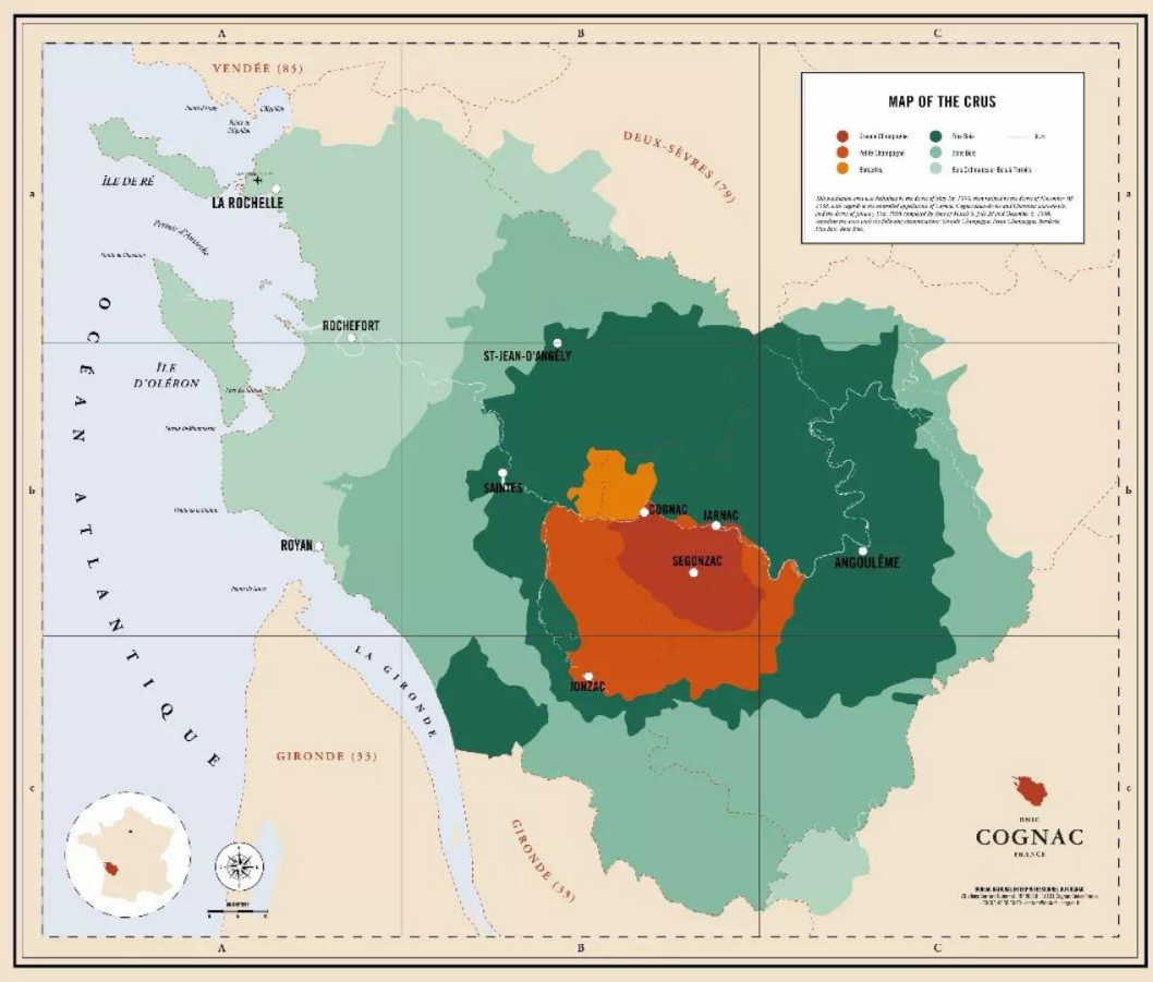 干邑產區位于法國西部,圍繞著同名的干邑市展開(Cognac)。如果你熟悉法國地理,你立刻就能發現,干邑產區其實就在波爾多隔壁。