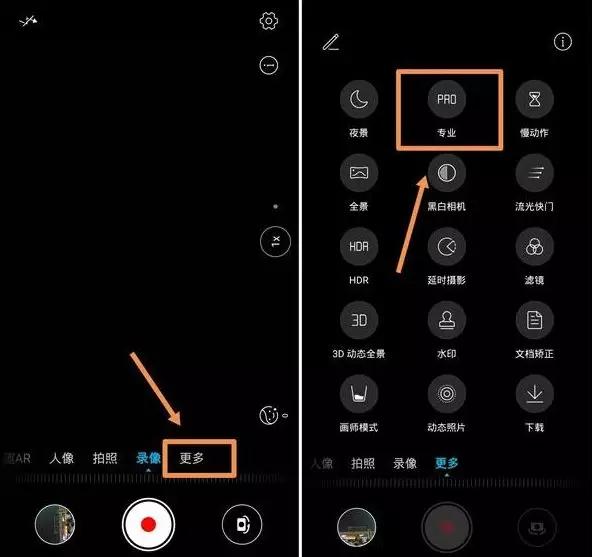 打開相機后,在主界面下面有個“更多”,我們點擊后界面上就會多出許多選項,第二個就是“專業”模式(各個型號的專業模式方法開啟來不一樣,大家如果找不到,可自行搜索自己手機的打開方式)。
