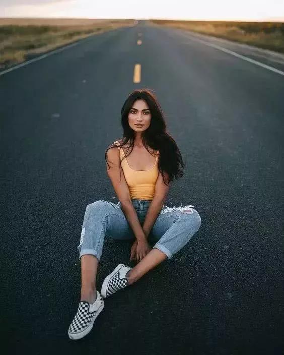 馬路上通常都會有標記的線條,而這就是一個很好的利用道具。比較簡單的拍照姿勢就是人坐在線上、斜坐在線上,或者是邁開腿站在線上。