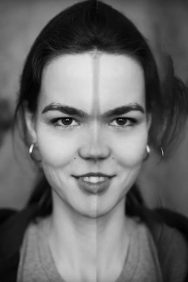 你也可以另辟蹊徑,不追求完美對稱——讓鏡面和臉部對稱軸重合,轉而在特殊的地方創造對稱面,同樣能收獲很有趣的照片: