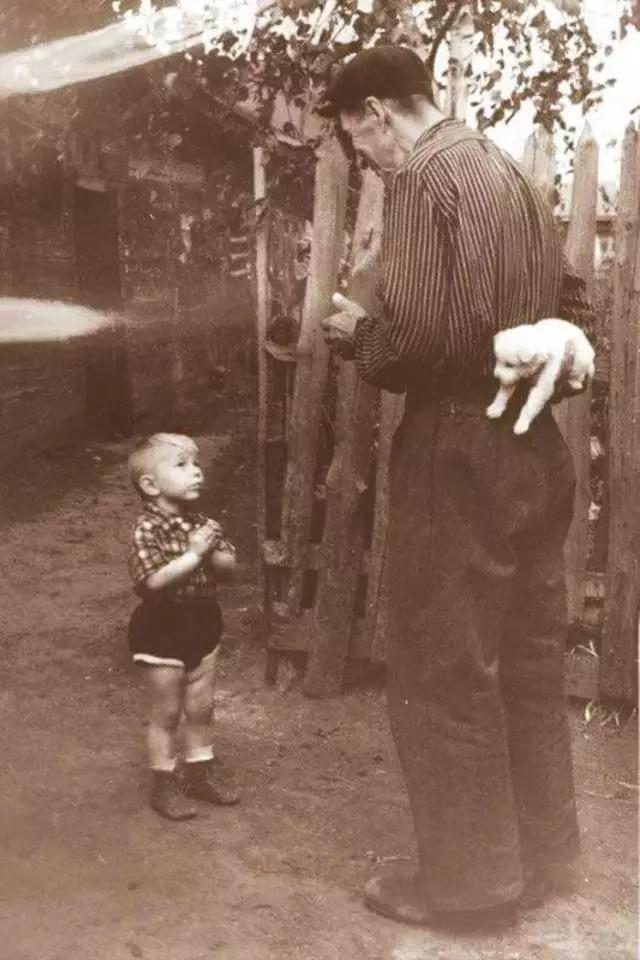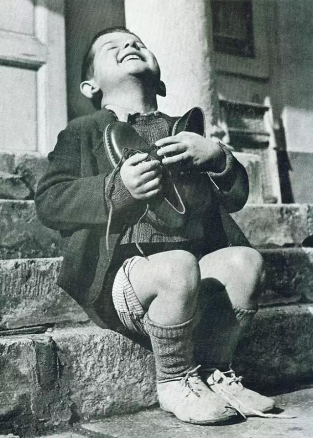 二戰中,第一次收到新鞋的小男孩,抱著鞋子開心極了。他腳上的那雙真的不能再穿了。