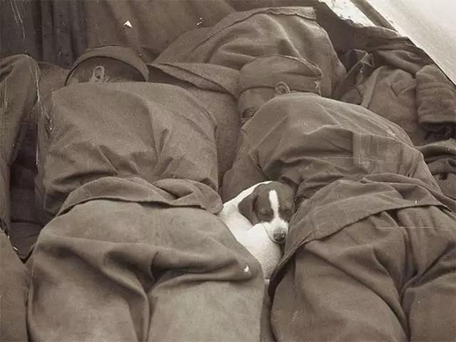 二戰的戰場上,兩個士兵護著一只狗狗就這樣安穩地睡著了。