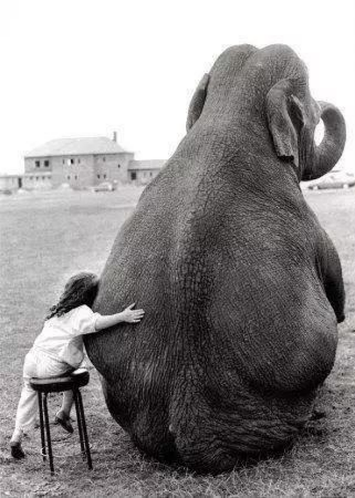 小女孩坐在凳子上,親昵地抱著身邊的大象,一大一小兩個背影,看起來如此和諧美好。