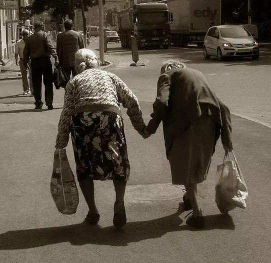 兩個年歲已經很大的老奶奶,正牽著手慢慢地一步一步地往前走著。
