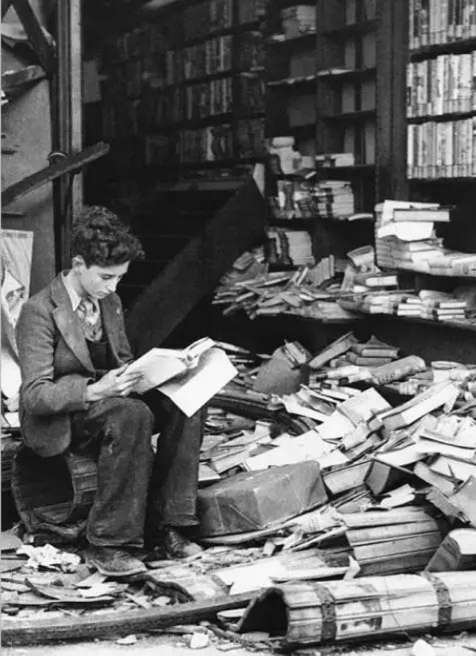 被炸毀的書店里,書籍散落了一地,一片狼藉里,一個少年正坐在那安安靜靜地看著一本書。
