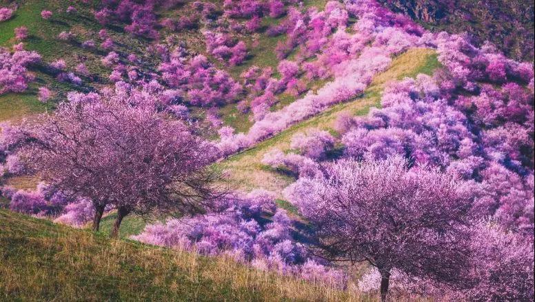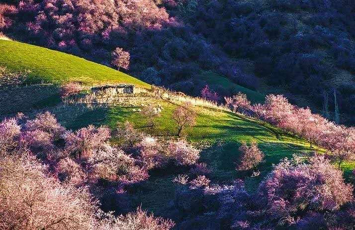 杏花溝山坡起伏,線條優(yōu)美,每到春暖花開之際,隱藏在伊犁河谷深處的野杏林便變身人間仙境,完勝三生三世十里桃花。
