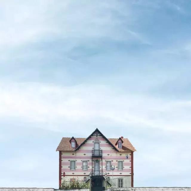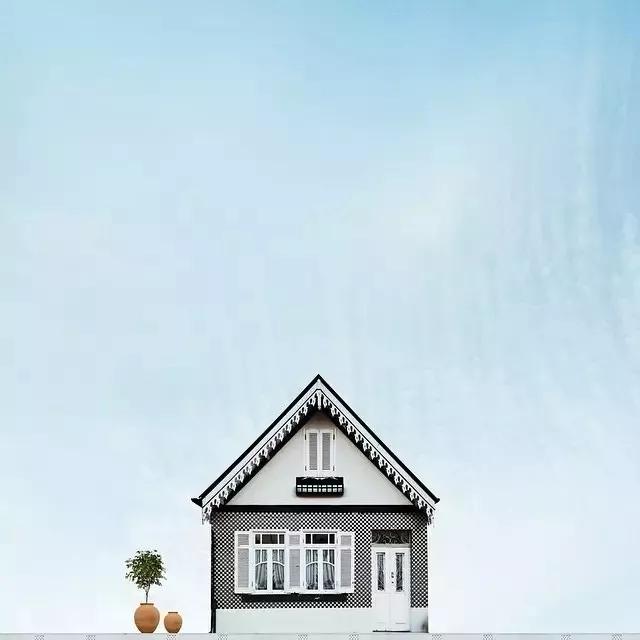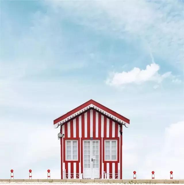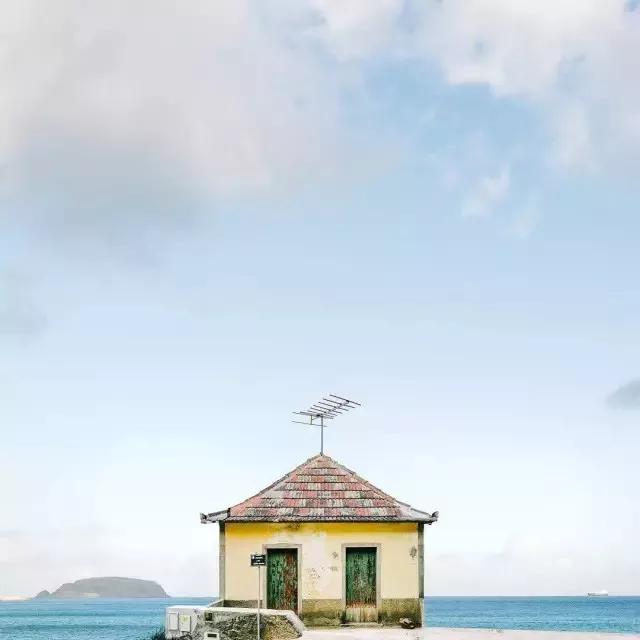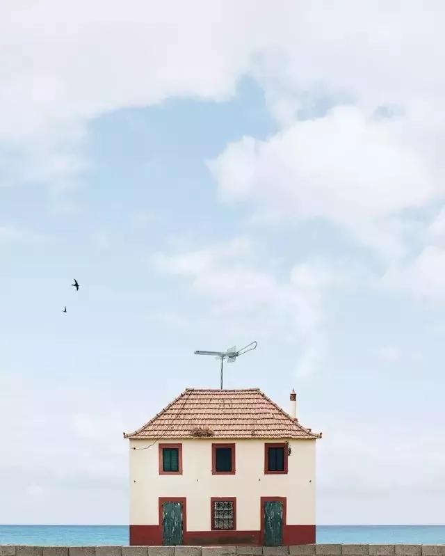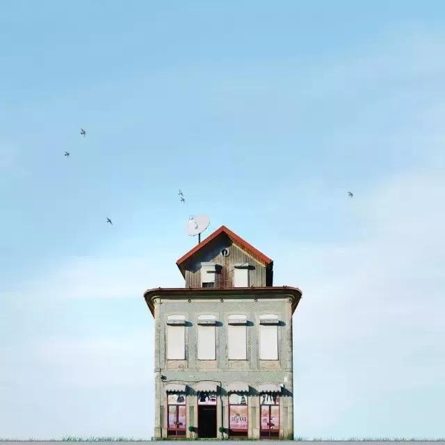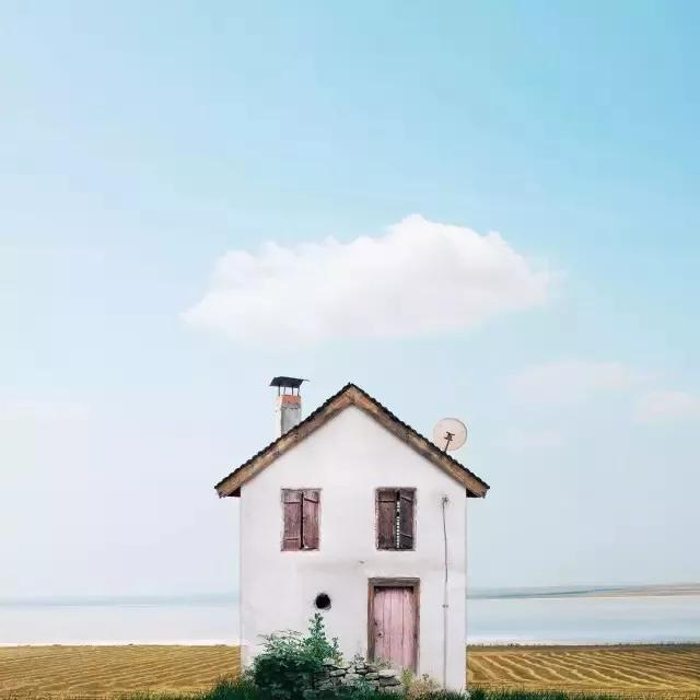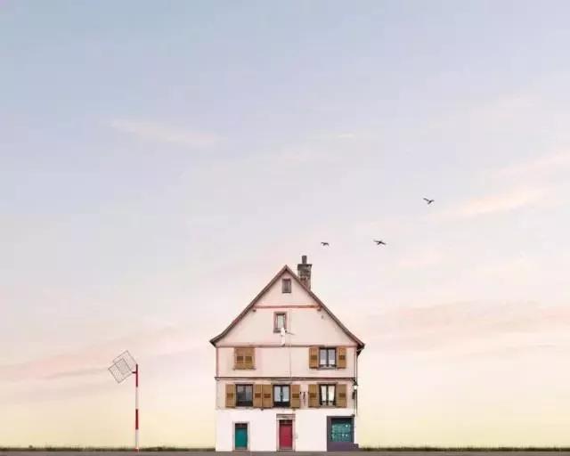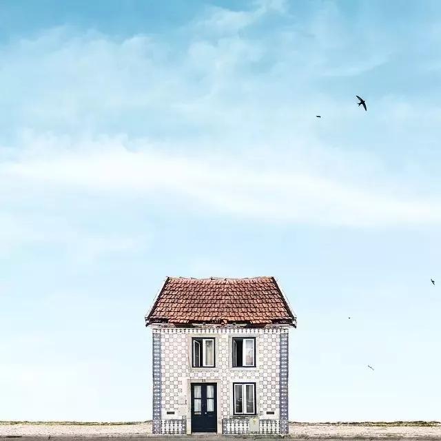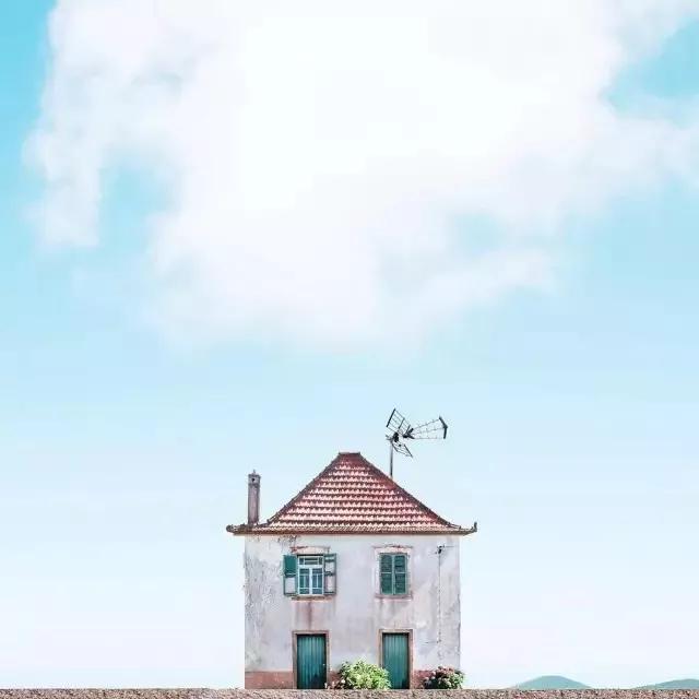 他的拍攝風格統一,偏愛極簡構圖,多以藍天白云為背景,畫面的主角則是一座小房子。
