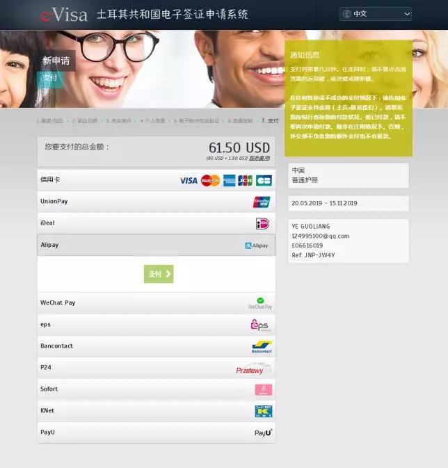 進入付款頁面,支付61.5美元的費用,其中60美元為簽證費,1.5美元為服務(wù)費。