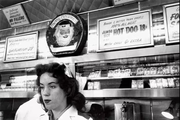 他在擁擠的大街上,在暗淡的酒吧里,在熱鬧的集會中,甚至在行駛的汽車里,利用徠卡相機不搶眼的特點以及高速膠卷、廣角鏡頭和超焦距等便利,完全用現場光,大量搶拍所見到的一切。