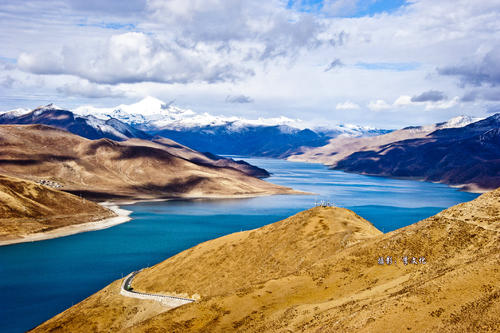 這里是俯瞰羊卓雍措湖的最佳地點:山頂上有云層覆蓋,在湖面投下巨大的不規(guī)則身影。蔚藍的天空與湖水相映。純凈的湖水在陽光下呈現(xiàn)深淺不同的藍色:淺藍、深藍、孔雀藍,還有一些是綠色的。平靜的湖面皺起魚鱗般的細小波浪,那一汪碧水是如此地深邃,奪人魂魄。