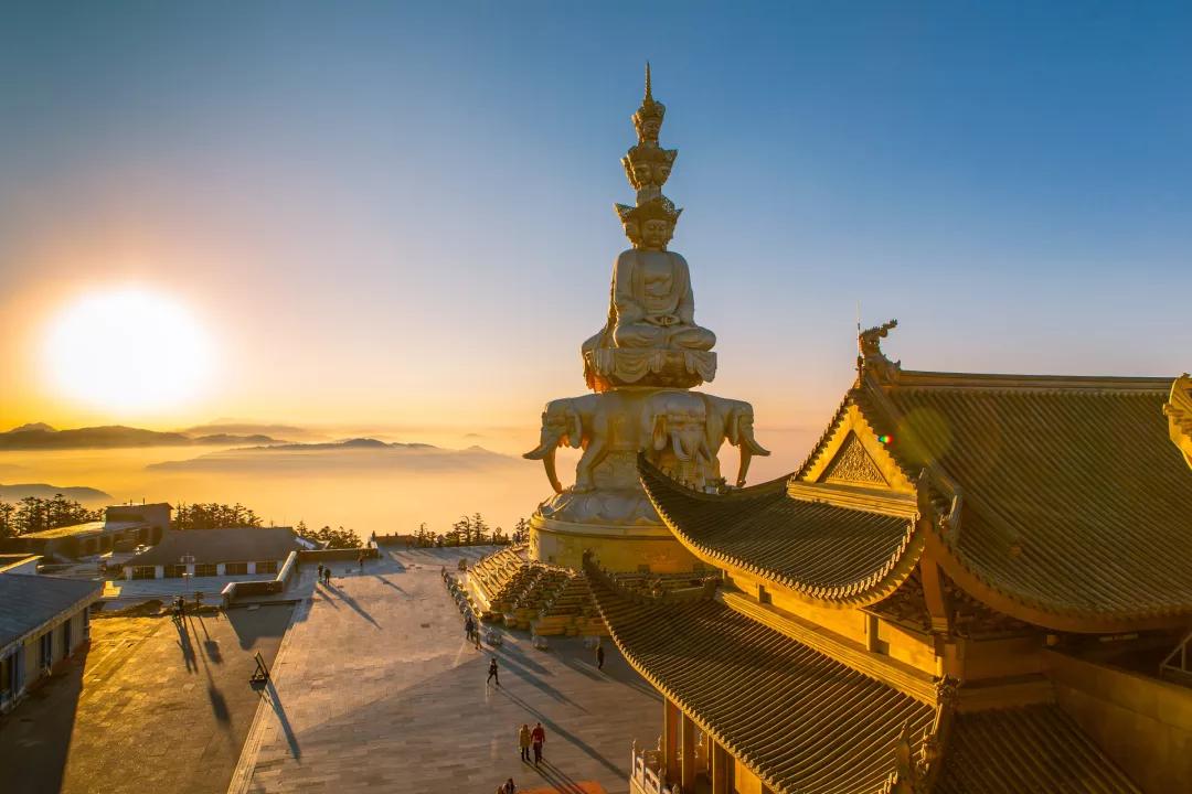 金頂擁有全世界最大的禮佛廣場,在這里你可以朝拜48米高的【十方普賢】,與如織游人一起進殿朝拜禮佛,披著金色日光與佛光交織而成的袈裟,體會全球最雄偉的佛教銅象的神圣和莊嚴;或是順著那清幽的羊腸小道,感受“一山有四季,十里不同天”的自然景色;還可以在舍身崖俯瞰川西平原的優美風光,領閱一覽眾山小、風光無限好的意境;