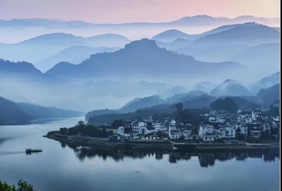 若你遠(yuǎn)來(lái),登一艘船,置身山水泛舟江渚,看不盡,兩岸山林霧罩,江上水鳥(niǎo)鳧行水氣成煙如夢(mèng)似幻;