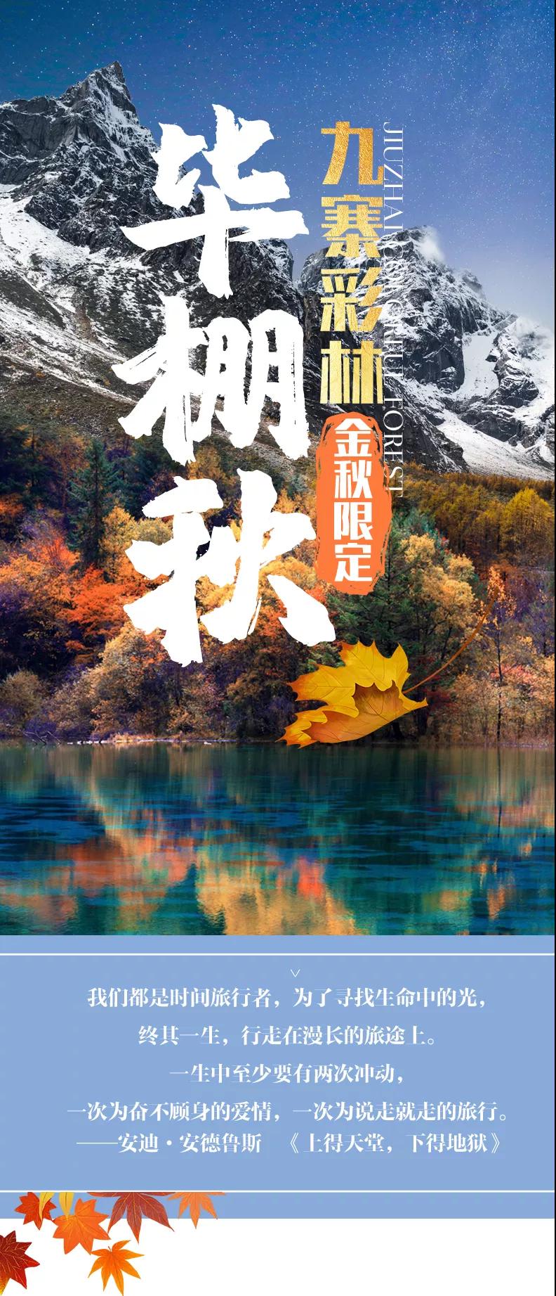 (1)服裝:九寨溝秋季平均氣溫在15℃以下,且沿途高原地區晝夜溫差很大,早、晚氣溫偏低,要注意晚上防寒保暖,建議準備防風的外套、沖鋒衣、防寒羽絨服。