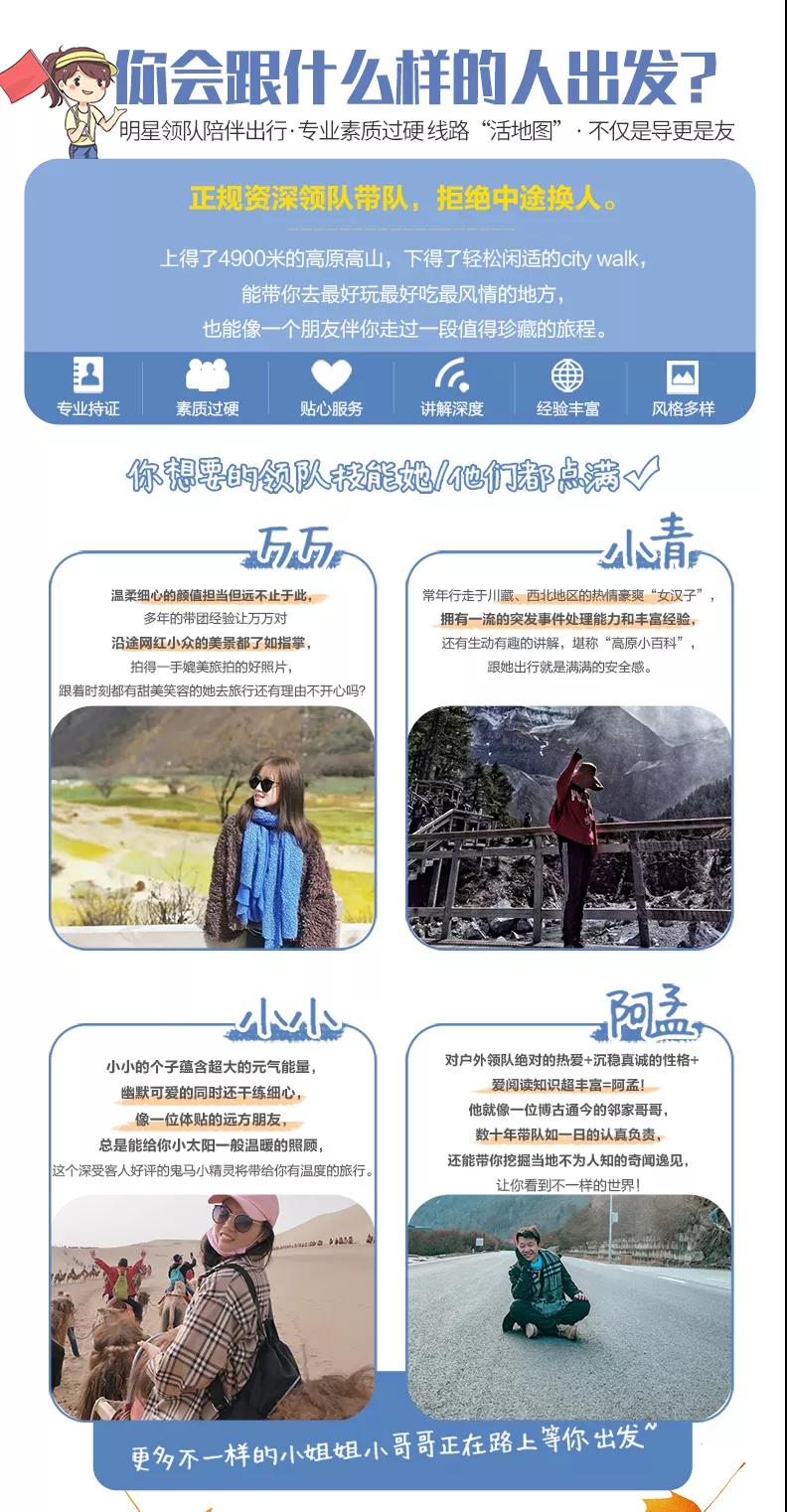 私人訂制:我們業務范圍囊括了全國各大城市,川西、西北、東北,在路上永遠有我們的身影。我們將為每一個有定制需求的你策劃出獨屬于自己的完美旅行。