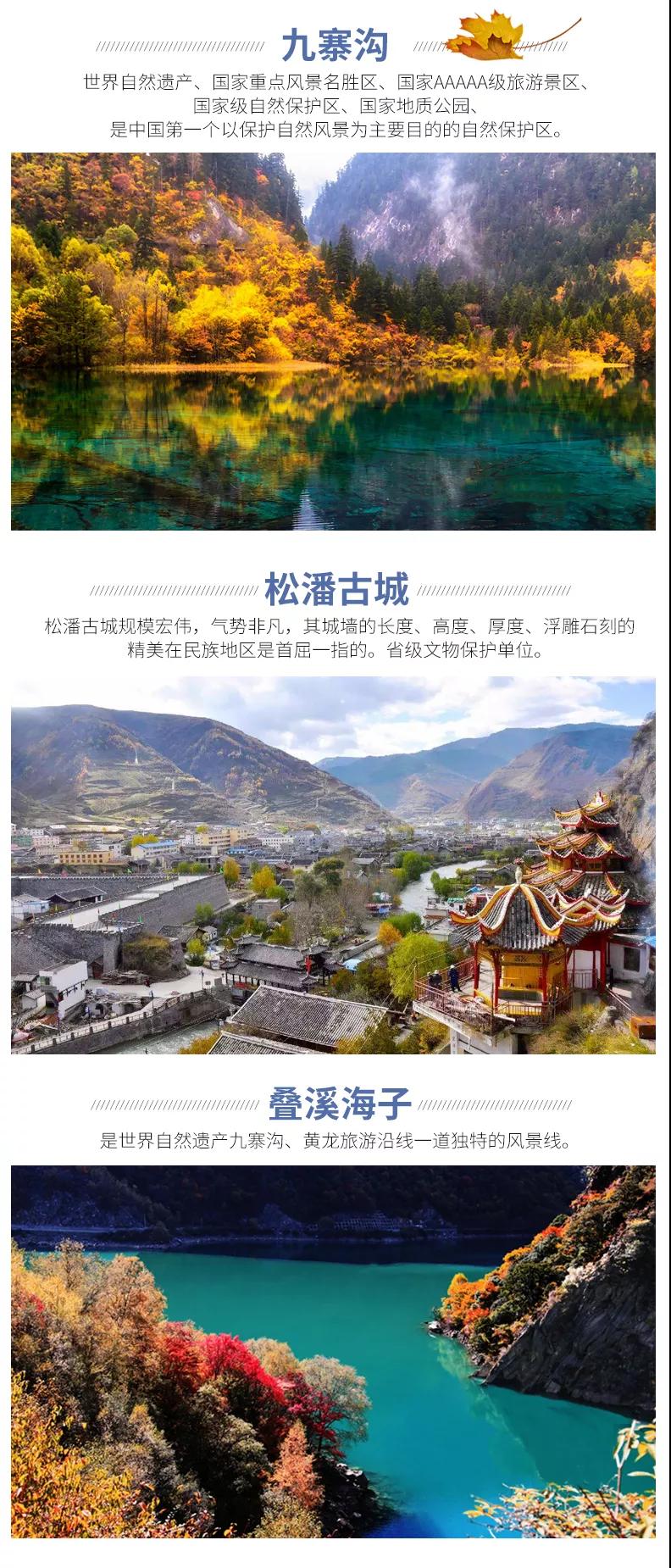 含全程九寨溝門票、黃龍風景區門票、畢棚溝門票。