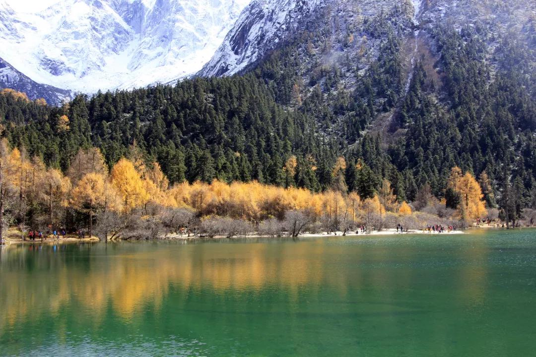然后我們抵達被譽為“四季山水,山水世界”的旅游圣地——【畢棚溝】。秋天是畢棚溝景色最有層次的時候,遠眺藍天山尖已戴白帽,山腰處卻還斑駁著枯黃與灰綠,濃綠的樹、深紅的葉、青青的湖、湛藍的天,此時的畢棚溝真正當得上一個“五彩斑斕”。沿兩旁塞滿了楓樹、槭樹、鵝掌松、落葉松的小路踱步,遠瞻奇特的萬年冰川,看奔騰不息的瀑布懸飛而下。這是離成都最近的最美秋色,畢棚溝金秋的層林盡染會告訴你,這一切都值得。
