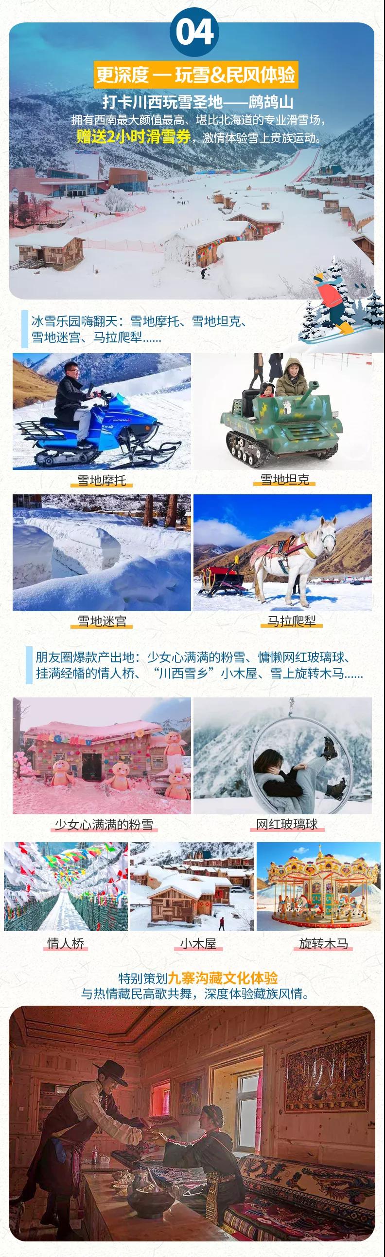 吃過(guò)精美的酒店自助早餐后我們開(kāi)始我們的錯(cuò)峰九寨滑雪之旅,途經(jīng)汶川,最后抵達(dá)【鷓鴣山自然公園】。我們?cè)诰皡^(qū)門(mén)口換乘觀光車(chē)前往冰雪世界樂(lè)園景區(qū)。鷓鴣山自然公園山高谷深,風(fēng)景秀麗,擁有優(yōu)越的高山及森林資源,尤其是于冬季劃分的滑雪場(chǎng)、戲雪場(chǎng)2個(gè)獨(dú)立區(qū)域,多種游玩趣味和游玩方式更是吸引了成千上萬(wàn)的“賞雪”“玩雪”愛(ài)好者前來(lái),各式各樣高達(dá)18種的玩雪項(xiàng)目(自費(fèi)項(xiàng)目具體可參考費(fèi)用不含部分)能滿足大部分玩家的需求。在這里我們安排了2小時(shí)的雪上貴族運(yùn)動(dòng)——滑雪體驗(yàn),在專業(yè)滑道上來(lái)一次刺激的“雪上俯沖”,菜鳥(niǎo)級(jí)別的你在滑雪時(shí),可能會(huì)與大地進(jìn)行多次親密接觸,不過(guò)不摔兩跤又怎么能學(xué)會(huì)滑雪呢?