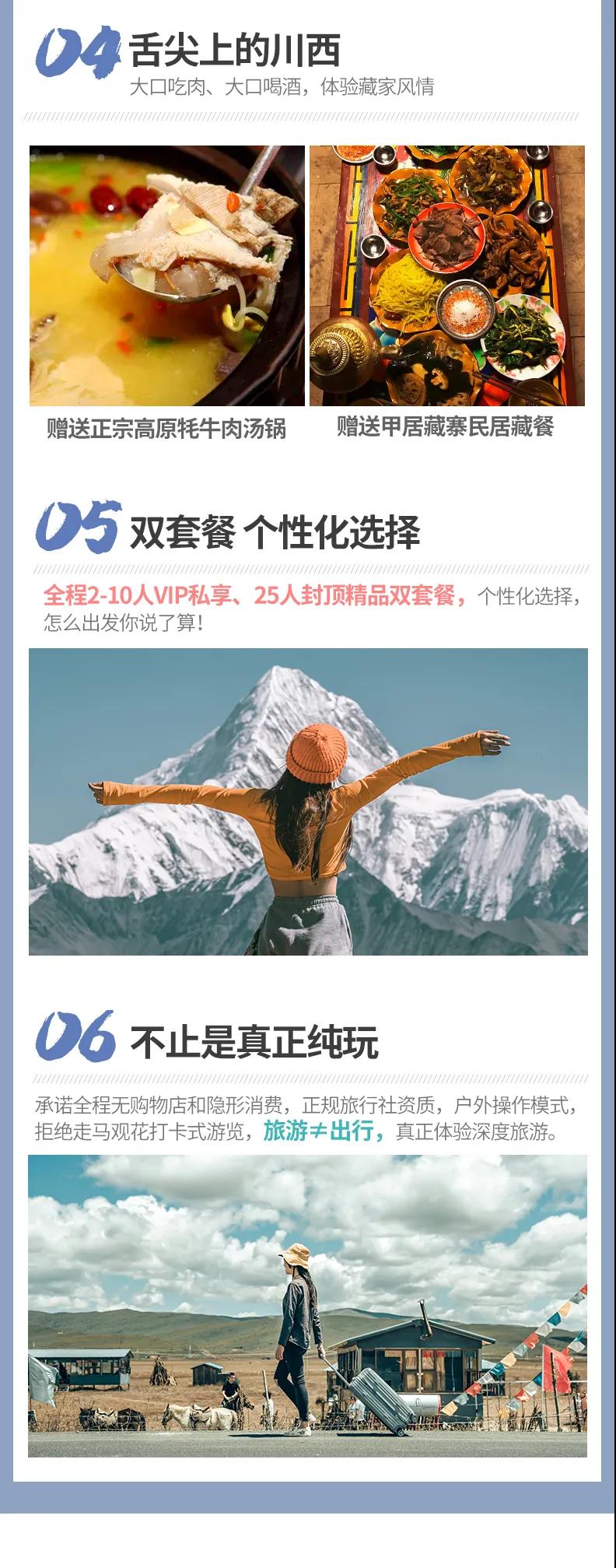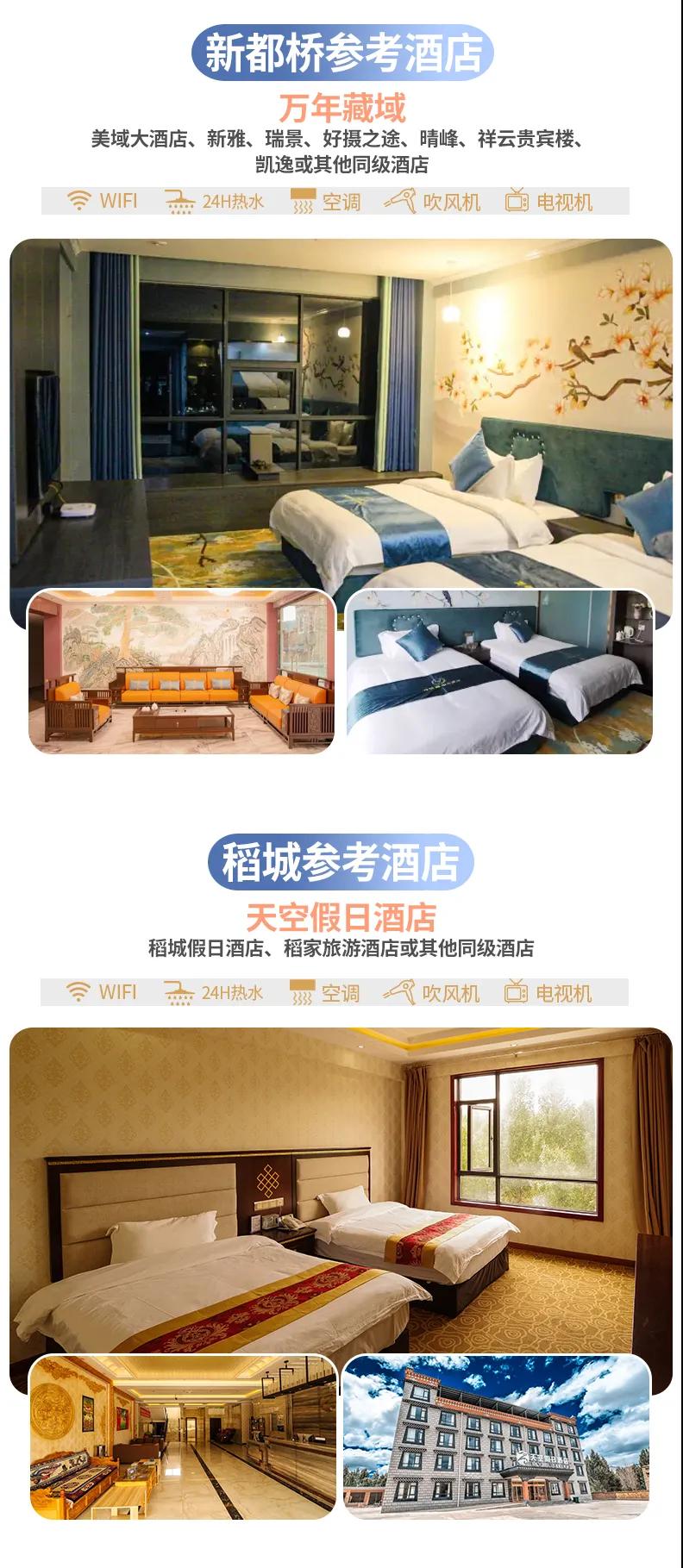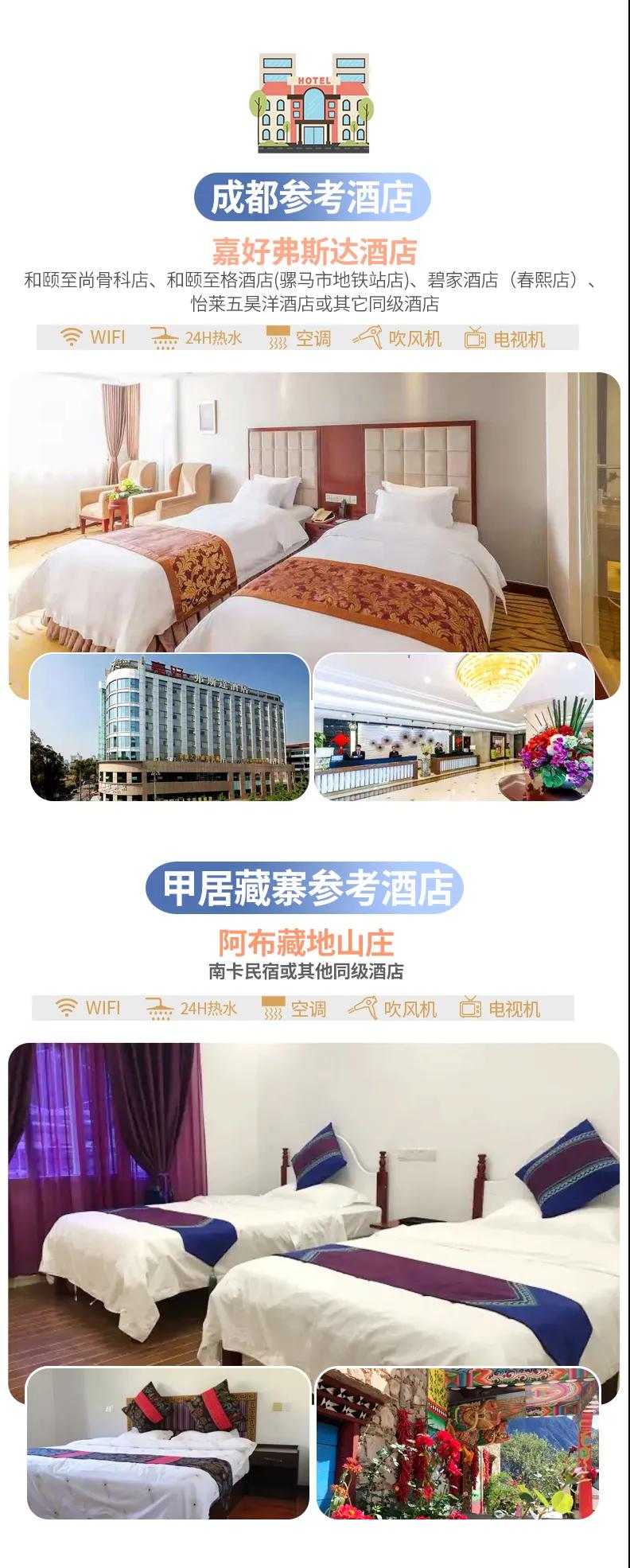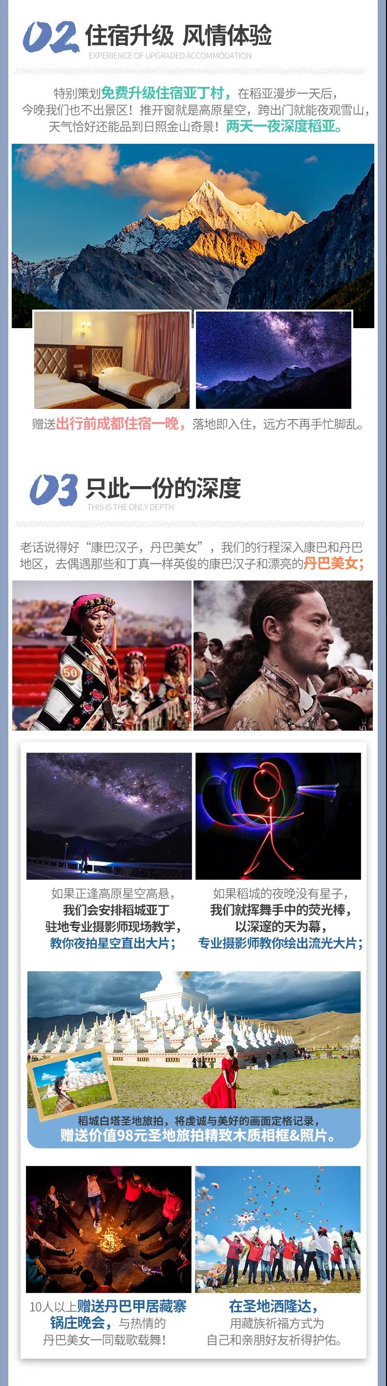 ? 贈送:特色贈送甲居藏寨藏家晚餐、高原特色牦牛湯鍋;贈送旅游三寶、魔術頭巾、礦泉水緩解旅途疲勞;贈送藏地撒隆達;贈送價值98元圣地旅拍精致木質相框&照片;贈送稻城專業攝影師現場教學夜拍星空直出大片,沒有星星時則教拍流光大片;10人以上贈送甲居藏寨篝火晚會;贈送成都市區24小時接機/接火車服務;贈送項目不用不退。