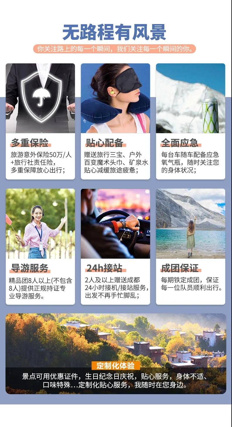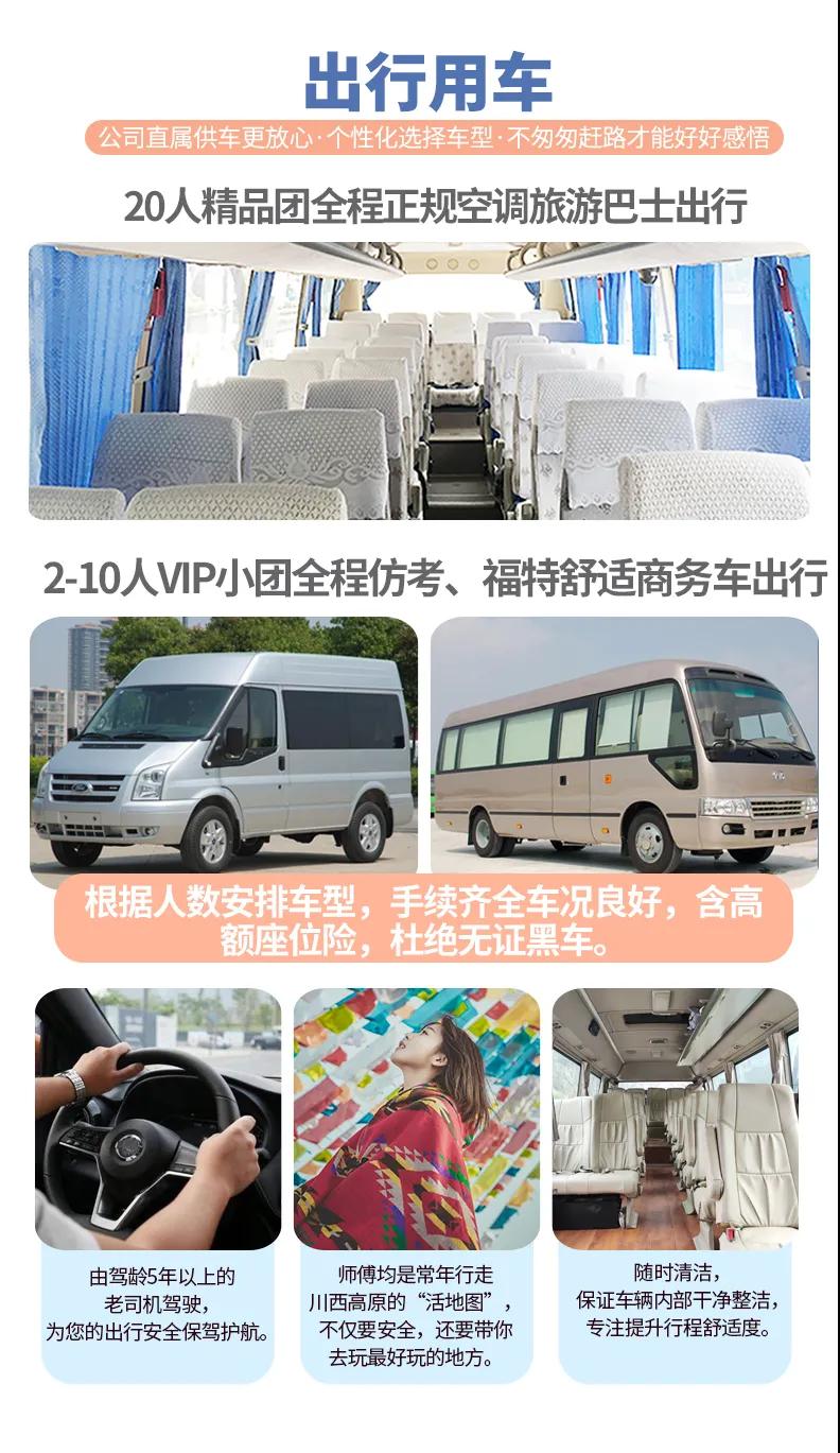 1、關于車輛交通:目前四川旅游市場8座以下車輛無法辦理旅游牌照,請游客知悉,以此理由提起的投訴我方拒不受理,望您諒解。