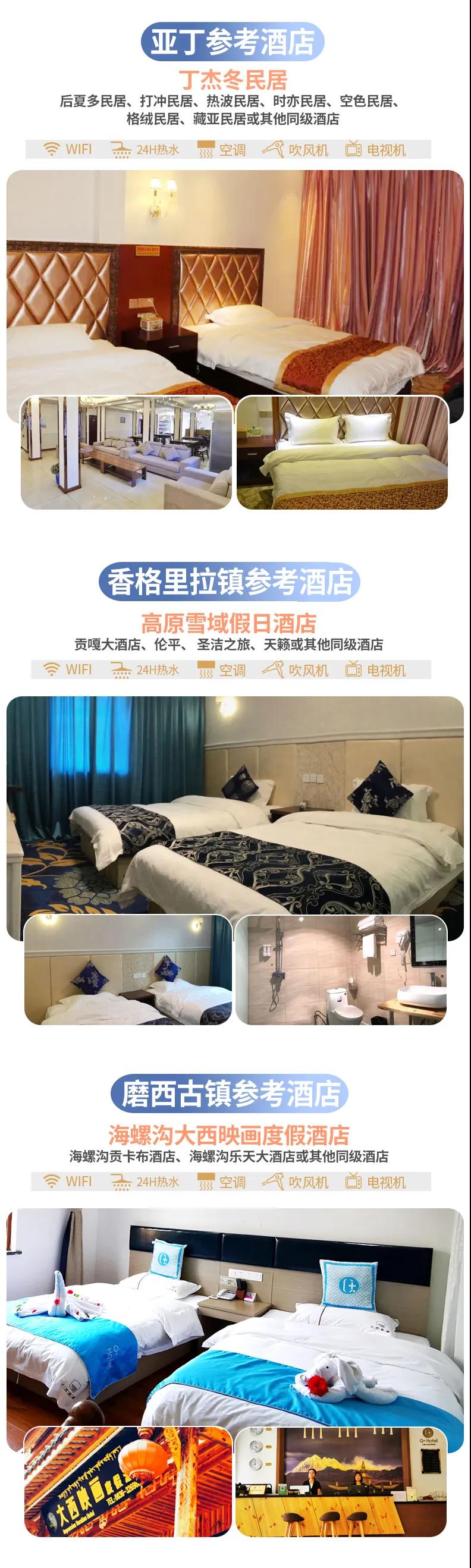 ? 門票:丹巴甲居藏寨門票50元/人、四姑娘雙橋溝門票80元/人、墨石公園門票60元/人、亞丁景區門票150元/人、海螺溝門票+景區保險(必須)95元/人(若由我方安排居住在香格里拉鎮產生60元的二次進溝費用,該費用由我方贈送承擔)。