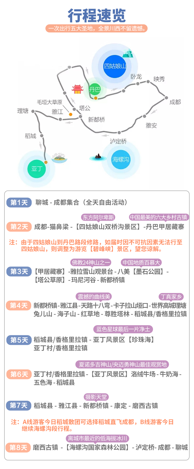 溫馨提示:A線游客今日稻城散團,可于今日退酒店后選擇稻城直飛成都結束本次旅行,B線游客今日繼續海螺溝段行程。