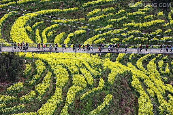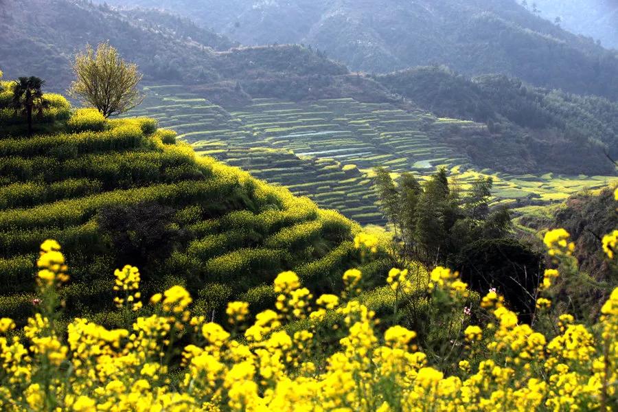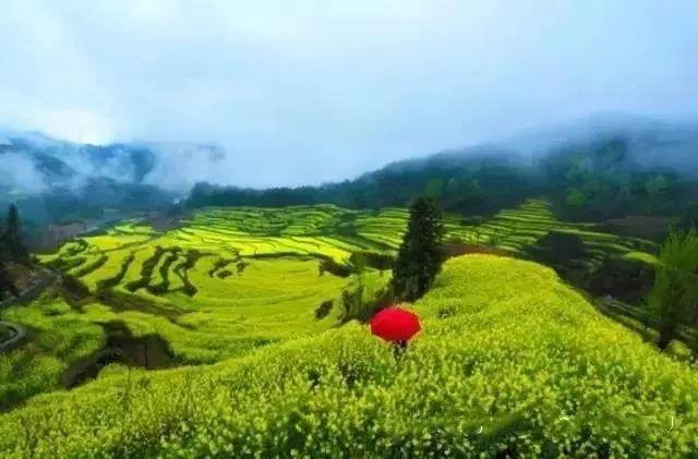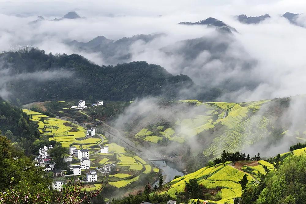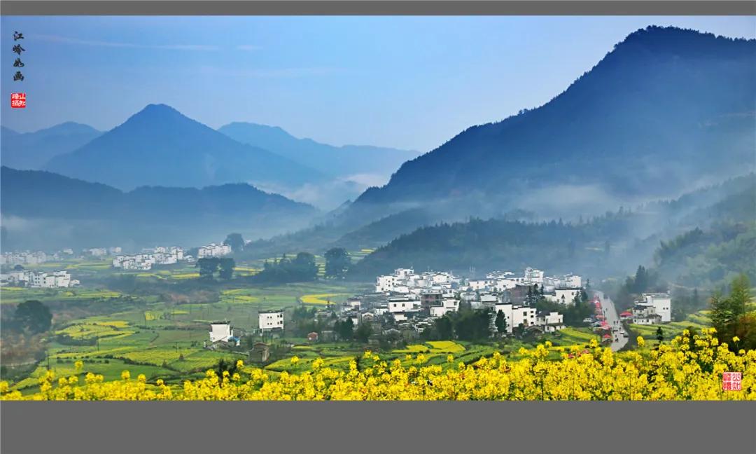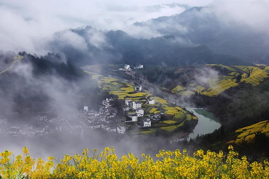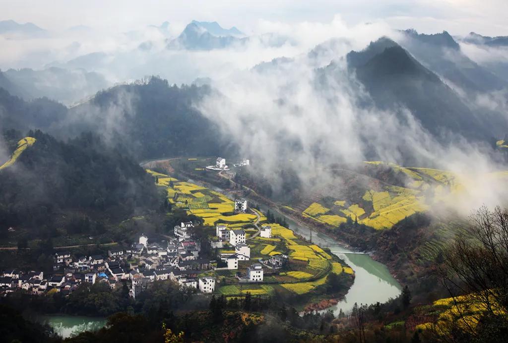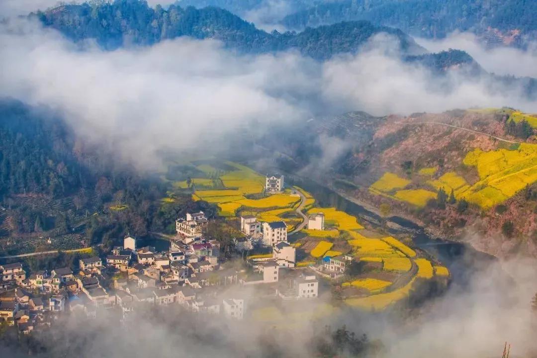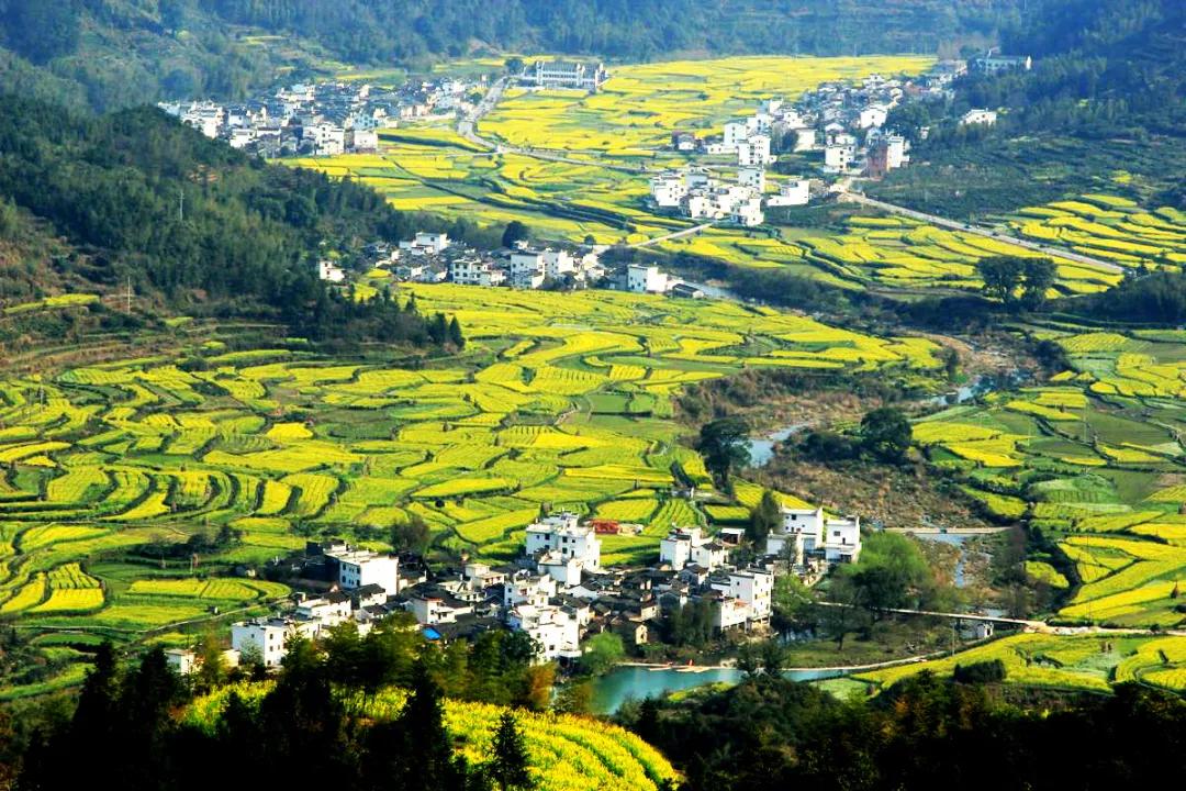 江嶺南臨曉起,東接溪頭,地處婺源縣最東北,是婺源最值得去的地方。站在山頂望去,腳下大片的山谷內,油菜花層層疊疊,一望無際,中間圍攏著幾個小小的村落,黑瓦白墻的徽派民居夾雜在一片金黃之間。