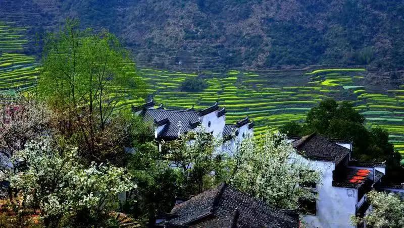 粉墻黛瓦的徽州古民居點綴于廣闊的油菜花叢中
