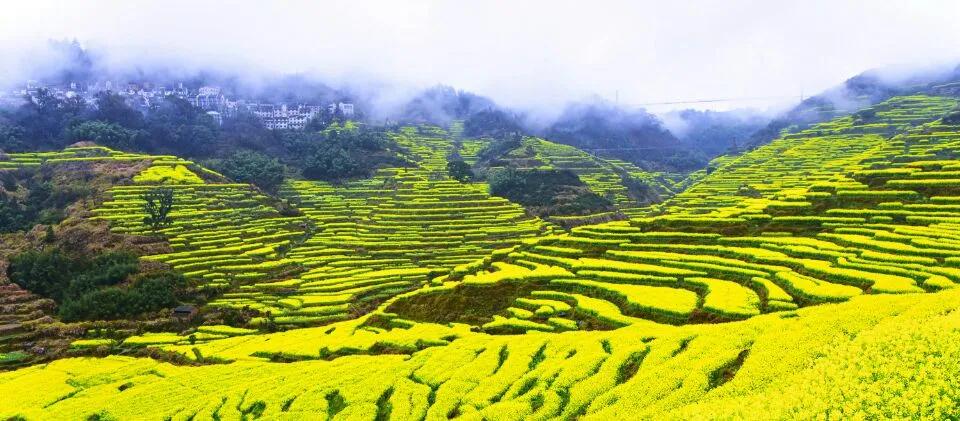 那里漫山遍野的油菜花呈梯田狀,從山頂鋪散到山谷下。