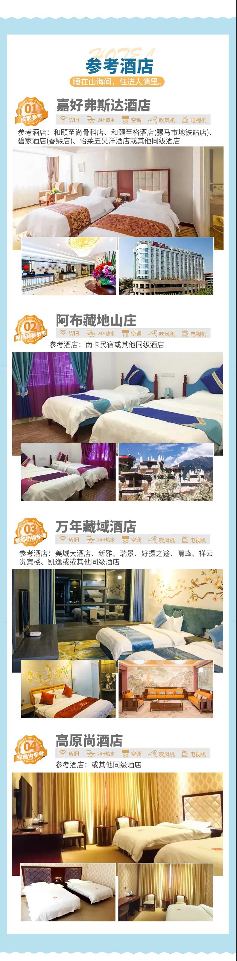 4、住宿:含全程5天4晚舒適酒店,確保酒店干凈衛生,溫馨舒適。因沿途高原藏區條件有限,如果酒店設施沒有達到您的期望,敬請諒解。參考酒店如下(僅供參考,實際以訂房為準):
