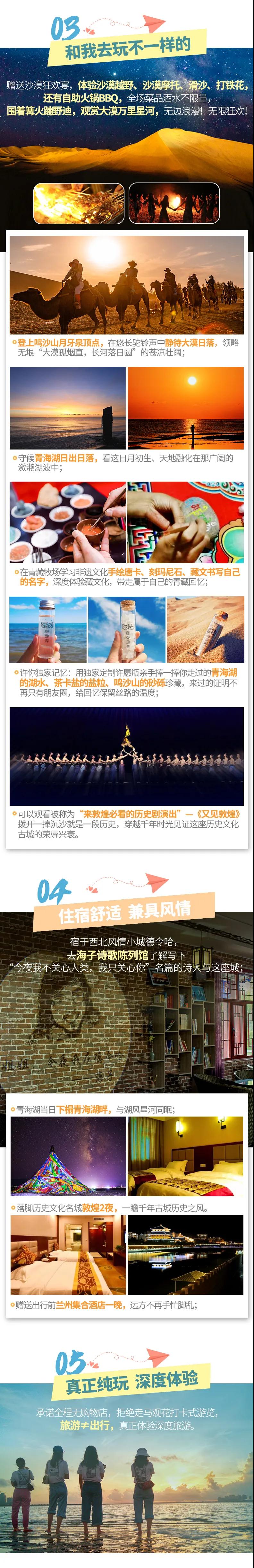 最后我們抵達敦煌,有人說過,這里的風都有歷史的氣息。晚上我們就在這座古老的城市里來一場【沙漠狂歡】,在大漠無垠的星空之下體驗刺激的沙漠越野、沙漠摩托,玩玩有趣的滑沙、打鐵花,還有自助火鍋BBQ,全場菜品酒水不限量,大口吃肉大口喝酒,圍著沙漠篝火蹦個野迪!無限狂歡,無邊浪漫!