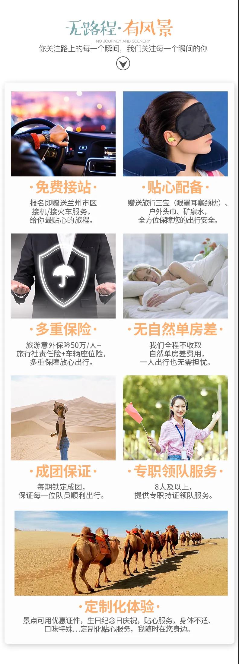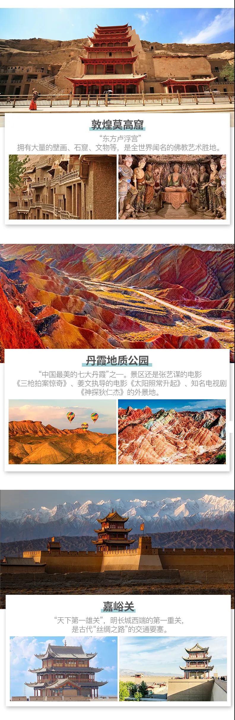 1. 敦煌莫高窟景區自2015年6月起實行數字展示中心數字洞窟展示和莫高窟實體洞窟體驗的預約參觀模式,每天限6000人參觀,團隊參觀時間嚴格按照莫高窟預約場次進行,因此,敦煌段景點參觀順序會根據莫高窟時間進行調整或同團客人安排不同時間游覽,敬請配合。
