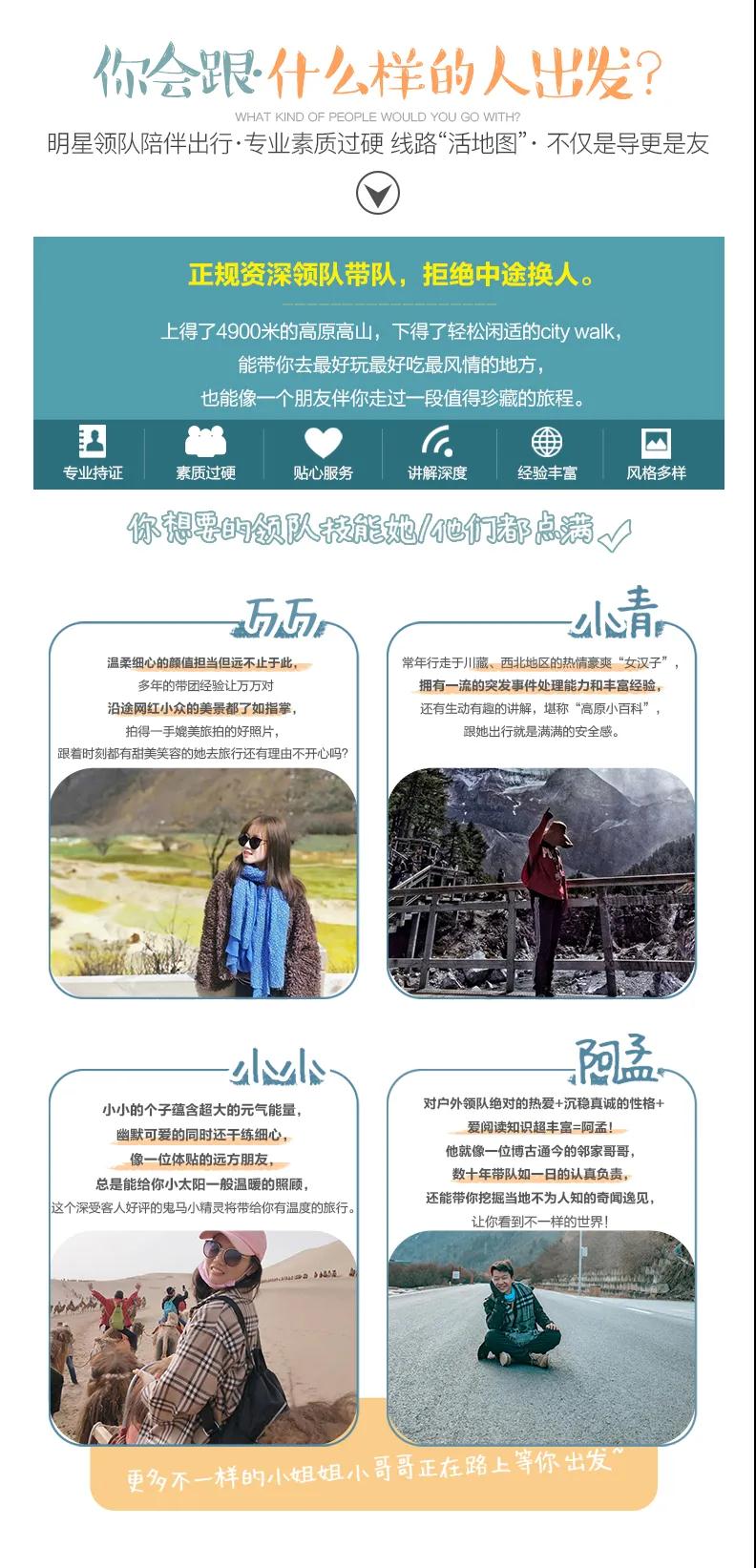 3、沿途會經過少數民族聚居族地區,請游客尊重當地宗教信仰、民俗民風,遵守景區規定。行程若存在景點需騎馬,為您的安全著想,騎馬必須由馬夫牽韁方能騎行,請勿獨自騎馬或騎馬奔跑,險路及下坡路必須下馬步行,否則造成的損傷,概由游客自行承擔。