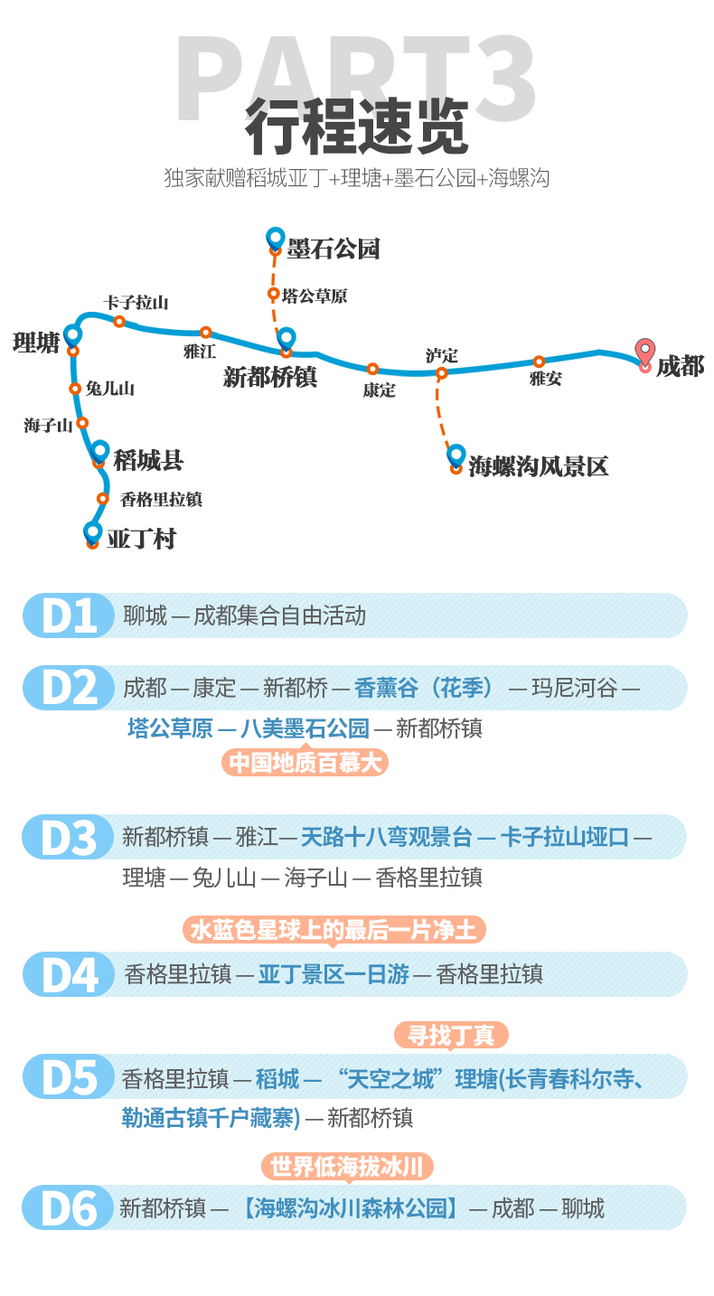 新都橋鎮 — 海螺溝冰川森林公園 — 瀘定 — 成都 — 聊城