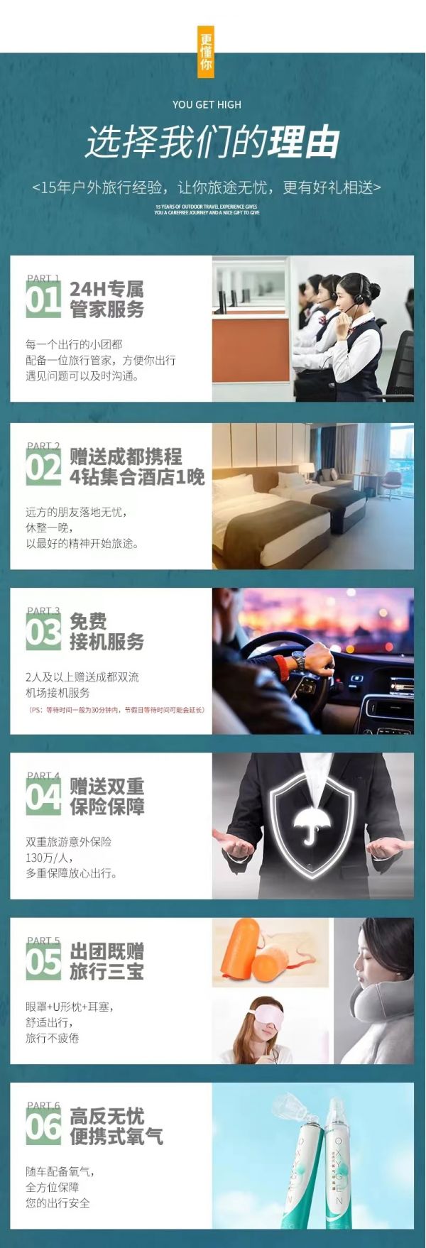 3、沿途景區景點、餐廳、廁所、加水點、高原緩沖區內設有小賣部、超市、旅游紀念品、手工藝土特產等販賣攤點,非我方安排,請游客根據自身需求及興趣選擇消費,并保留好購物小票以便后續維權;購物時請保管好隨身攜帶的物品,不到人多、擁擠的地方購物,不當眾清點錢包里的鈔票,也不隨商品推銷人員到偏僻地方購物或取物。